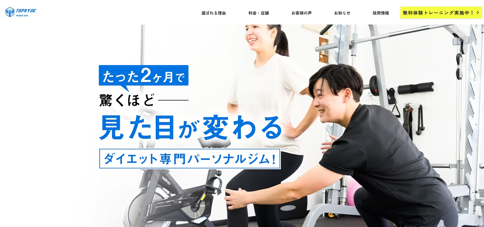 Top Ryde(トップライド)は、見た目を変えることに特化した初心者専門のダイエットパーソナルジムです。