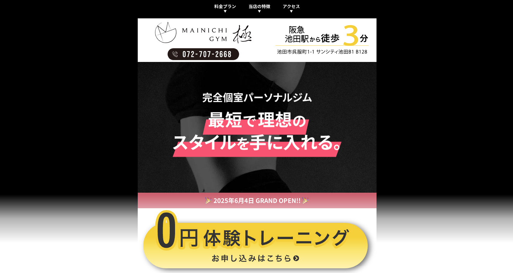 MAINICHI GYM 極は、月額43,780円(税込)で回数無制限のパーソナルジムです。