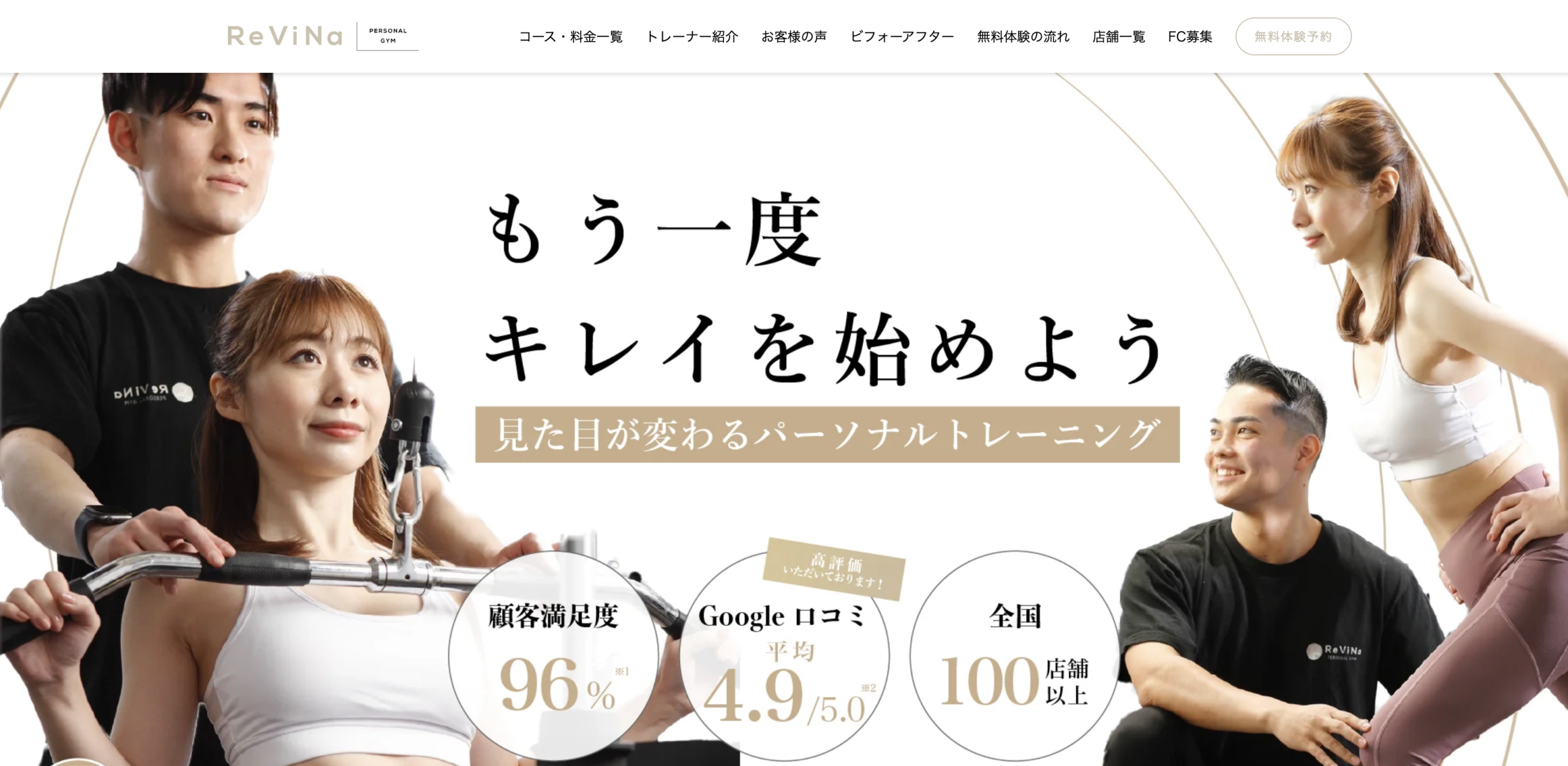ReViNa(レビナ)は全国100店舗展開のパーソナルジム。トレーナー全員が美ボディコンテスト入賞者で、見た目の仕上がりにこだわったボディメイクが強みです。
